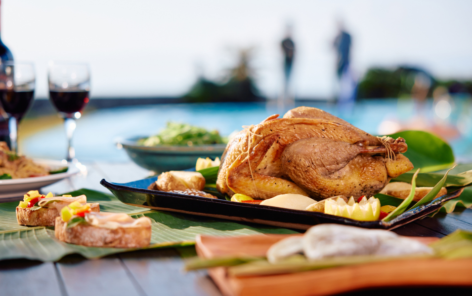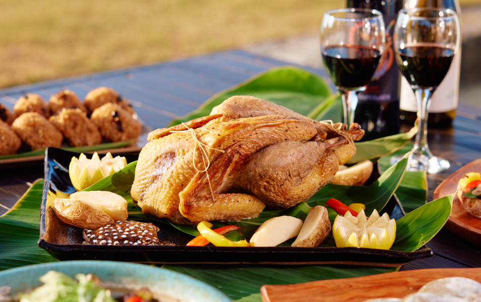島育ちの与論牛やほろほろ鳥などのう旨味豊かなお肉や、新鮮なお魚や夜光貝・もずくなどの海産物が食卓を彩ります。また、海風のミネラルと太陽をたっぷり浴びた芳醇なマンゴーやドラゴンフルーツ、爽やかなパッションフルーツなどの南国フルーツや、